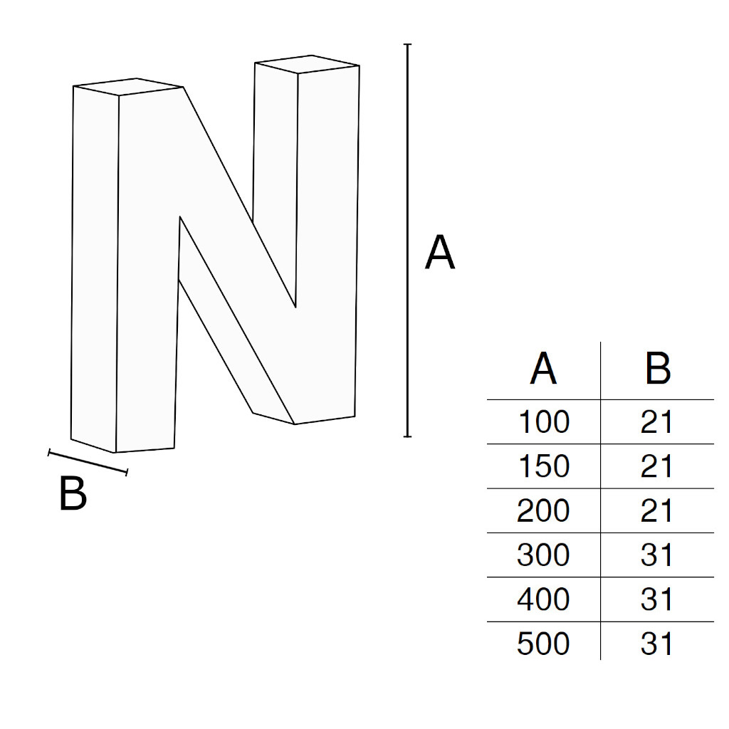 - 100 | 150 | 200 | 300 | 400 | 500 mm (Letras de A a Z)